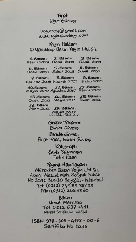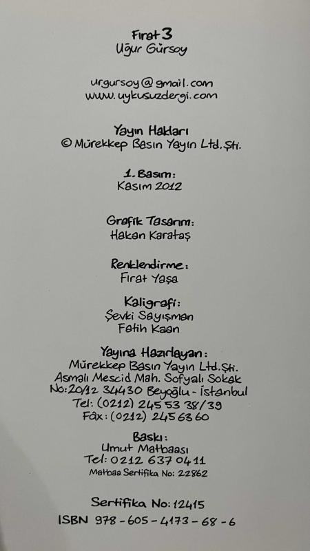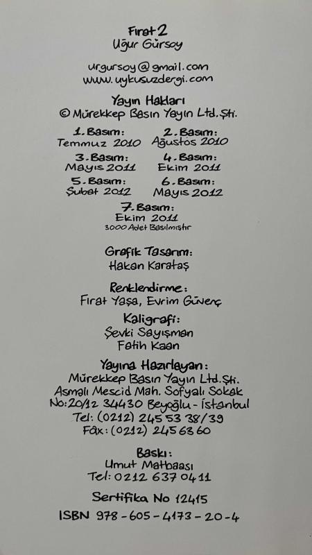 Fırat 9786054173006 Baskı: Mayıs 2012 17. Baskı, İstanbul 60 Sayfa Merhaba Fırat... Hadi uyan yaramaz.... Fırat... Hişt... Günaydın delikanlı, benden korkmana gerek yok... Dün gece beni kafanda sen yarattın, artık senin hayali arkadaşınım... Belli ki yalnızlıktan sıkılmış duygusal bir çocuksun arkadaşlığımız ikimizin küçük sırrı olucak anlaştık mı? Anlaştık. Anne demin adam gördüm. Oha! Hemen söyledi Ayı!.. Nurten teyzene iniyorum ben, ortalığı dağıtma. Fırat 2 9786054173204 Baskı: Ekim 2011 7. Baskı, İstanbul 60 Sayfa Fırat 3 9786054173686 Baskı: Kasım 2012 1. Baskı, İstanbul 64 Sayfa Keşge aşırı güçlü bi insan olsa dünyadaki herkesin azını kırsa, sen senin annen baban, ben benim annem babam hariç… Pekiiii… süpermen mi güçlüdür görükmez adam mı? Enee oramı bükme ameliyatlı yerim orası. Bana ne yalıycam hep yerleri! bana ne canım sıkılmasaymış o zaman! Göt bok sıç töbe töbe allam yanlışlıkla aklımın içine girmiş inneatayna. Sübhaneke dinimiz amin. Burası Almanya’ymış meğersem. Şaka komedisi yapmıştım. Gelme evde köpek var bizim. Demin yoktu, şindi geldi. Burası senin mi olum Allah’ın ki! azından mı öpmüş!