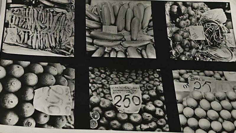 Fiyat etiketi ile satışa sunulan sebzelerin tezgahta ki fotoğrafı.ORJİNAL SİYAH & BEYAZ 17x12cm EBADINDA - 1940'LAR, 1950'LER, 1960'LAR ve 1970'LER, en son 9 ay önce güncellenmiştir.