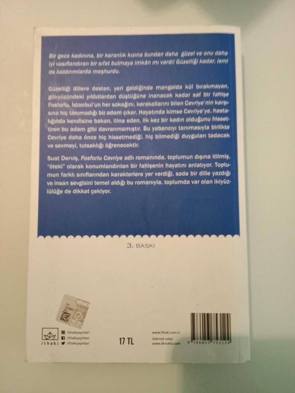 Fosforlu Cevriye, Suat Derviş tarafından kaleme alınmıştır. Kitap 2018 yılında İthaki Yayınları tarafından 9786053753124 ISBN kodu ile yayınlanmıştır. Satışta olan kitap, yayınevinin 3. baskısıdır. 274 sayfadır. Fosforlu Cevriye adlı eser Türkçe dilindedir.