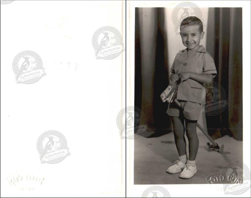 Foto Gün, Mersin, Fotoğraf Stüdyosu, Fotoğraf, 1950’ler: Kısa pantolonlu küçük bir erkek çocuğu, elinde oyuncakla stüdyo fonu önünde ayakta poz veriyor., 3 gün önce satışa sunulmuştur.