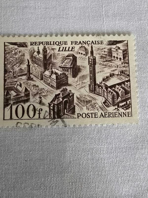 Fransa'nın kuzeyindeki büyük şehirlerden Lille'in mimari manzaralarını gösterir. Üzerinde görülen yapılar arasında Porte de Paris (Paris Kapısı), Bourse du Commerce (Ticaret Borsası) ve Belfry (Çan Kulesi) gibi simgeler bulunmaktadır. Pulun üzerinde gördüğünüz gibi sol altta büyük puntolarla 100F değeri ve sağ altta POSTE AÉRIENNE ibaresi yer alır. Bu pullar, uluslararası hava yolu gönderileri için özel olarak basılmıştır.
