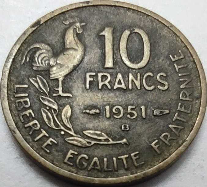Fransa'nın Dördüncü Cumhuriyet dönemine ait bu 1951 yılı 10 Frankı, ünlü sanatçı Georges Guiraud tarafından tasarlanan ikonik bir nümismatik eserdir. Paranın ön yüzünde, Fransa'nın ulusal sembollerinden biri olan ve üzerinde şık bir miğfer bulunan Marianne büstü yer almaktadır. Arka yüzünde ise Fransa'nın özgürlük ve uyanışını simgeleyen, son derece zarif işlenmiş bir Galyalı Horozu (Gallic Rooster) figürü ve defne dalları bulunmaktadır. Alüminyum-bronz alaşımından üretilen bu sikke, kendine has altın sarısı tonuyla dikkat çeker. "Liberté, Égalité, Fraternité" (Özgürlük, Eşitlik, Kardeşlik) sloganıyla Fransız nümismatik geleneğini tam anlamıyla yansıtır. 1950'lerin başındaki bu seri, hem yüksek estetik değeri hem de Marianne ve Horoz gibi iki güçlü ulusal sembolü bir araya getirmesiyle koleksiyoncuların en sevdiği Fransız paraları arasındadır. Kondisyonu itibariyle horozun tüy detayları ve Marianne büstü net bir şekilde seçilmektedir.