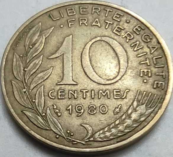 Fransız nümismatiğinin vazgeçilmez figürü olan Marianne, bu 1980 tarihli 10 Centimes üzerinde ünlü tasarımcı Henri Lagriffoul'un yorumuyla yer alır. Paranın ön yüzünde (obverse), başında Frig başlığıyla modern ve kararlı bir Marianne profili; arka yüzünde (reverse) ise buğday başakları ve meşe dalları arasına yerleştirilmiş nominal değer bulunur. Alüminyum-bronz alaşımından üretilen bu seri, kendine has altın sarısı tonuyla bilinir. 1962'den 2001'e kadar neredeyse hiç değişmeden basılan bu tasarım, Fransız halkının günlük yaşamında "Liberté, Égalité, Fraternité" (Özgürlük, Eşitlik, Kardeşlik) ilkelerini hatırlatan bir simge olmuştur. 80'li yılların Avrupa ekonomisindeki Fransız etkisini yansıtan, koleksiyonların temel birimlerinden biridir.
