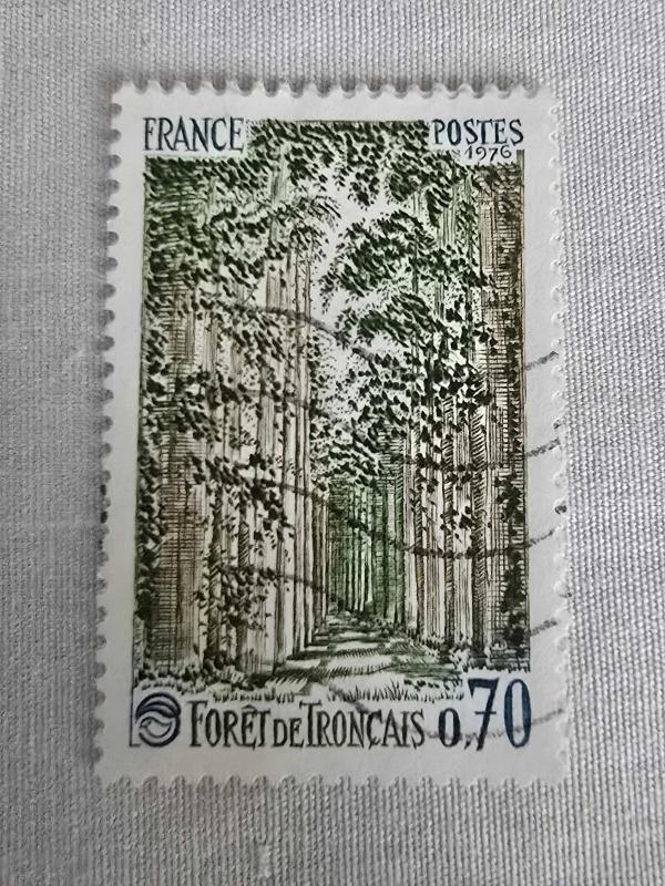 Teması: Forêt de Tronçais (Tronçais Ormanı). Bu orman, Fransa'nın Allier bölgesinde bulunur ve kaliteli meşe ağaçlarıyla ünlüdür. Pul, ormanın derinliklerindeki ağaçlık manzarayı tasvir etmektedir. Emisyon Yılı (Basım Tarihi): 1976.