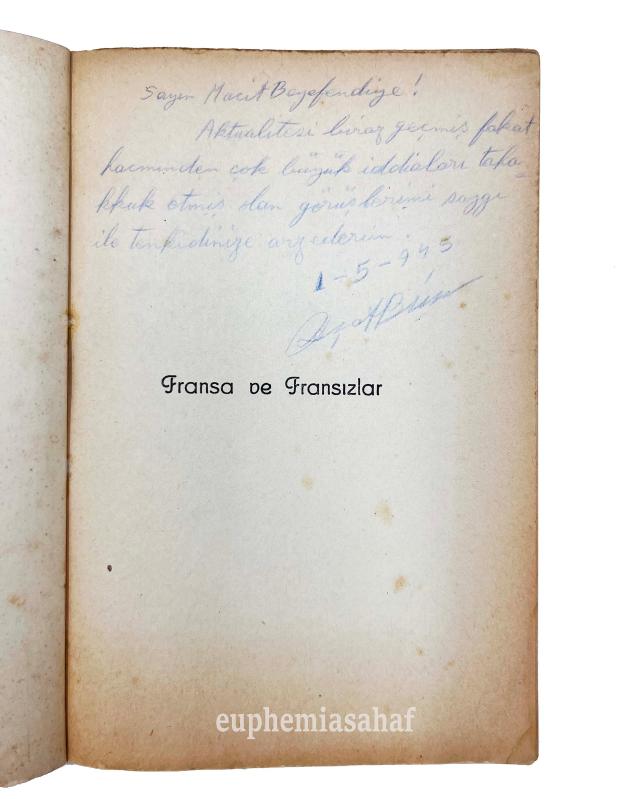 Özgün karton kapağında, temiz durumda, 20 x 14 cm, 48 sayfa. "Fransa ve Fransızlar -İMZALI-, R. BİÇER, Arkadaş Matbaası, İstanbul, 1941"