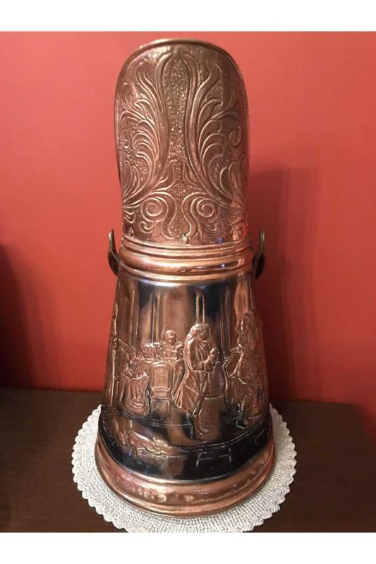 Fransız 51 cm boyunda porselen kulplu üzeri işlemeli bakır kömür kovası başlıklı antika/koleksiyon objesinin menşei belirtilmemiştir. Objenin ait olduğu dönem bilinmeketedir.
