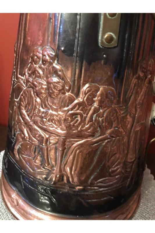 Fransız 51 cm boyunda porselen kulplu üzeri işlemeli bakır kömür kovası başlıklı antika/koleksiyon objesinin menşei belirtilmemiştir. Objenin ait olduğu dönem bilinmeketedir.