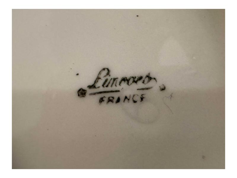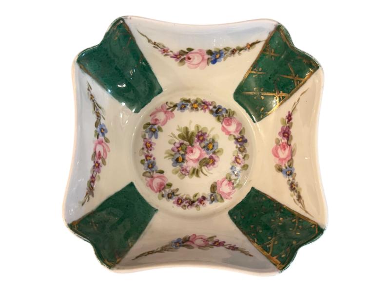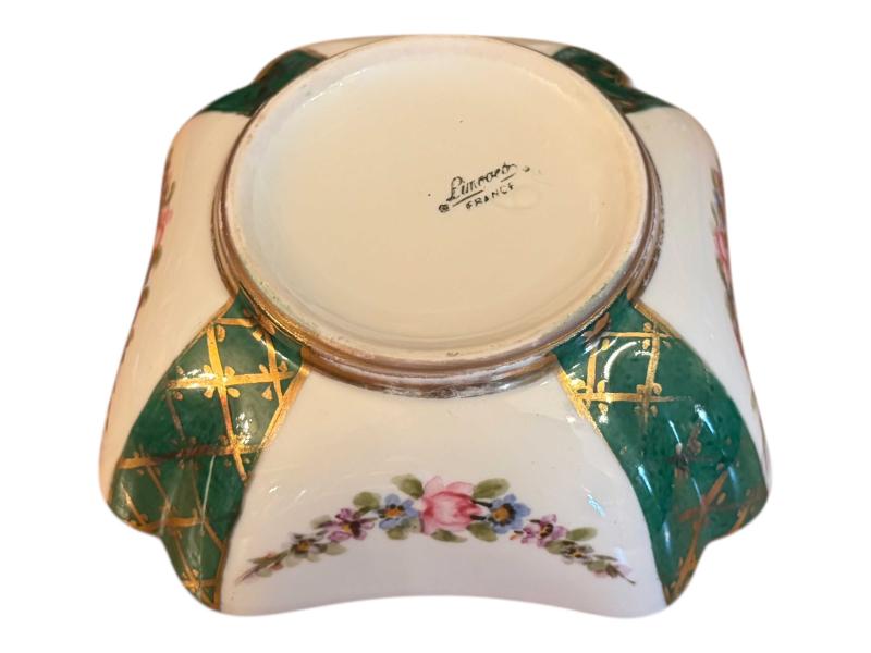 Fransız Limoges Poselen Kase Sunumluk 13x13x5 cm ölçülerinde başlıklı antika/koleksiyon objesi Avrupa menşe’lidir. Objenin ait olduğu dönem bilinmeketedir.