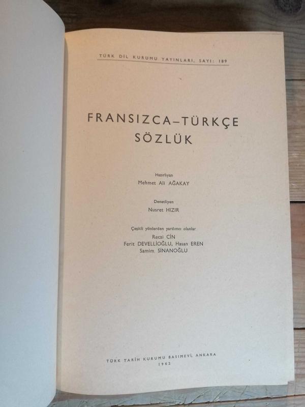 Forma sırtından dikişli bez ciltli, 2. hamur kağıt. Çok temiz durumdadır. Fransızca-Türkçe Sözlük Hazırlayan: Mehmet Ali Ağakay Denetliyen: Nusret Hızır Çeşitli yönlerden yardımcı olanlar: Recai Cin, Ferit Devellioğlu, Hasan Eren, Samim Sinanoğlu Türk Tarih Kurumu Basımevi, Ankara, 1962