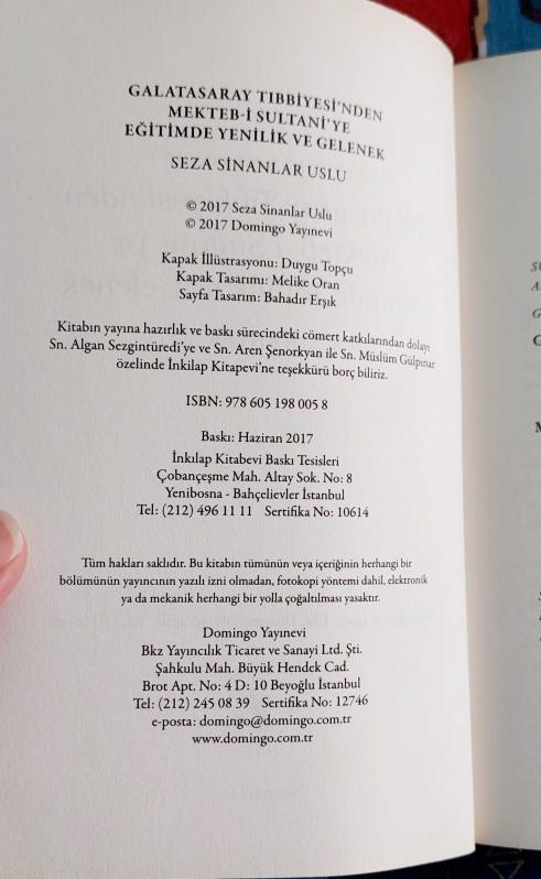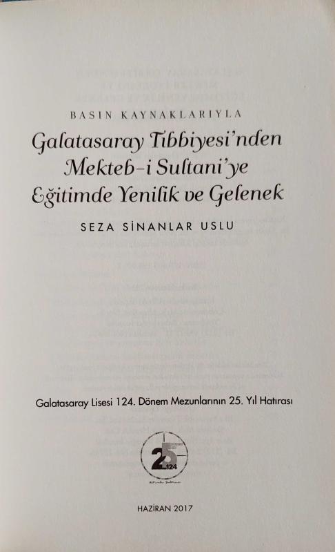 GALATASARAY TIBBİYESİ'NDEN MEKTEB-İ SULTANİ'YE EĞİTİMDE YENİLİK VE GELENEK, SEZA SİNANLAR USLU tarafından kaleme alınmıştır. Kitap 2017 yılında DOMİNGO YAYINEVİ tarafından [İSTANBUL] yayınlanmıştır. Satışta olan kitap, yayınevinin 1. baskısıdır. 110 sayfadır. GALATASARAY TIBBİYESİ'NDEN MEKTEB-İ SULTANİ'YE EĞİTİMDE YENİLİK VE GELENEK adlı eser İngilizce dilindedir.
