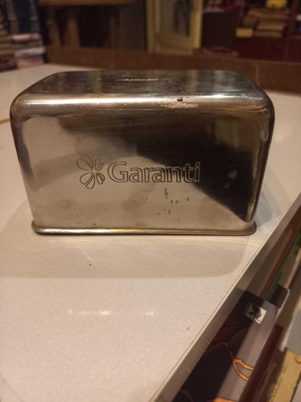 GARANTİ BANKASI PASLANMAZ ÇELİK KUMBARA başlıklı antika/koleksiyon objesi Türkiye menşe’lidir. 1950-1999 arası dönemine aittir.
