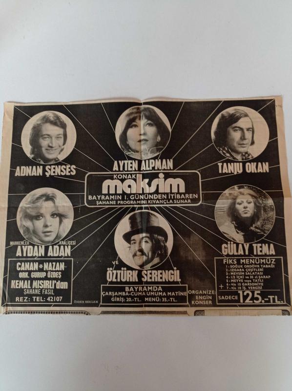 GAZETE GAZİNO REKLAMI SAYFASI - Ayten Alpman - Adnan Şenses - Tanju Okan - Ayhan Adan - Gülay Tema - Öztürk Serengil - Fiks Menü - Turizm Efes - İzmir Halı - Konak Maksim - Bayram