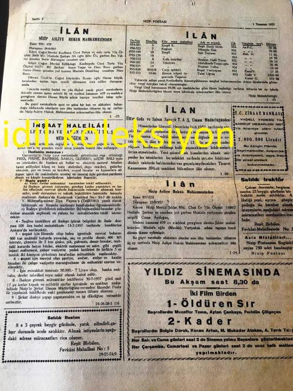 GAZİANTEP NİZİP POSTASI GAZETESİ YEREL TAŞRA BASINI ---1 Temmuz 1957 YIL :1 Sayı :57--Ankara daki yangında 30 ev ,40 dükkan ve 50 otomobil yandı -- Kaçakçılar bir jandarma çavuşunu şehit ettiler --Fransızlar Mahpusları İşkence Altında İnsan Eti Yemeğe Zorluyor --, TURAN UYGUR tarafından kaleme alınmıştır. Kitap 1956 yılında [YILDIZ MATBAASI] yayınlanmıştır. 2 sayfadır. GAZİANTEP NİZİP POSTASI GAZETESİ YEREL TAŞRA BASINI ---1 Temmuz 1957 YIL :1 Sayı :57--Ankara daki yangında 30 ev ,40 dükkan ve 50 otomobil yandı -- Kaçakçılar bir jandarma çavuşunu şehit ettiler --Fransızlar Mahpusları İşkence Altında İnsan Eti Yemeğe Zorluyor -- adlı eser Türkçe dilindedir.