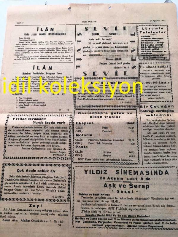 GAZİANTEP NİZİP POSTASI GAZETESİ YEREL TAŞRA BASINI -----23 Ağustos 1957 YIL :1 Sayı :75--Kazamızda Asya Gribi İhtimali Var --Narlı Ovasında Süne Mücadelesi -Tütün Etfal İçin Mühlik Veremdir --Afyon Canavarı İdam Edildi --Asya gribi tedavi çareleri Yıldız Sinemasında Bu Akşam Saat 8 de Aşk ve Serap -- Yıpranma, sararmalar, kupon kesiği ve yırtılmalar zamana bağlı olarak görülebilir.