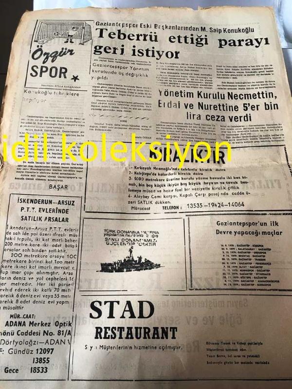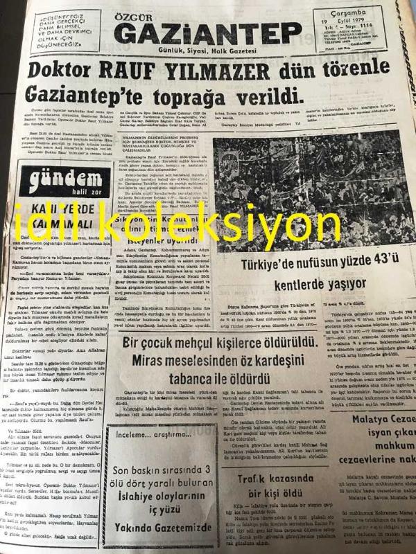 GAZİANTEP ÖZGÜR GAZİANTEP GAZETESİ YEREL TAŞRA BASINI ---19 Eylül 1979 Yıl :4 Sayı :1114-- Doktor Rauf Yılmazer Dün Gaziantep 'te Toprağa Verildi --Kanı Yerde Kalmamalı :Halil Zor -- Türkiye de nüfusun yüzde 43 'ü kentlerde yaşıyor --- Malatya Cezaevinde İsyan Çıkaran 32 Mahkum Başka Cezaevlerine Nakledildi --Büyüklerimiz Nihat Erim Allah Kerim Yazan :Uğur Mumcu Nihat Bey Sosyalizm Yolunda --Çocuk Yılı Samed Behrengi --Gaziantep Spor Eski Başkanlarından M. Saip Konukoğlu Teberrü Ettiği Parayı Geri İstiyor --Yönetim Kurulu Necmettin Erdal ve Nurettine 5 'er Bin Lira Ceza Verdi -- Yıpranma, sararmalar, kupon kesiği ve yırtılmalar zamana bağlı olarak görülebilir.
