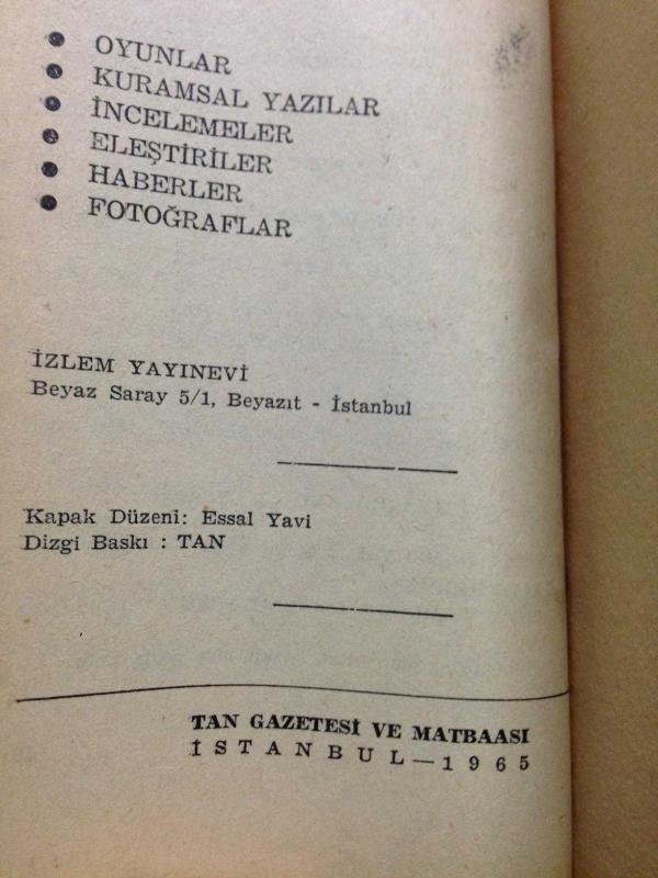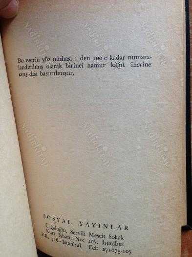 orijinal kapakları yok, PORTRELER adıyla şahıs ciltli, zaman isi sarısı, mükemmel korunmuş GECE GELEN TELGRAF : Gece Gelen Telgraf .. Portreler .. 1+1 = 1 .. NAİL V. … İzlem Yayınları –(1.baskı-1966)/ total 2.baskı .. 114 sayfa .. NAZIM HİKMET – ŞİİR NAİL V. : Yeni Sanatın Akını .. Kadavra .. Dışarııı Dışarı ... Nail V.nin Nazım Hikmetle birlikte, Amerikan şiirinden yaptıkları çeviriler NAİL V. (Nail Vahdeti Çakırhan, 1910-2008) : gazeteci, şair, çevirmen, uluslararası ödüllü mimar ve restoratör. İNEK : İzlem Yayınları – 80 sayfa – İLK BASKI-1965 / NAZIM HİKMET – TİYATRO .. İç sayfada “1967-şahsa ithaf” yazılı NAZIM HİKMET’LE ÜÇ BUÇUK YIL : Sosyal Yayınlar - 121 sayfa./ ORHAN KEMAL (1914-1970) .... 1965 yılında ilk kez yayınlandı. künye sayfasında baskı yılı yazmıyor. “Bu eserin yüz nüshası 1 den 100 e kadar numaralandırlmış olarak birinci hamur kağıt üzerine satış dışı olarak bastırılmıştır.” yazılı, tel. no 6 haneli, aynı ciltteki diğer kitaplar 65-66 baskısı, .. İLK BASKI ?