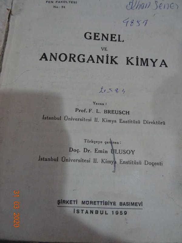 GENEL VE ANORGANİK KİMYA, F.L. BREUSCH-EMİN ULUSOY tarafından kaleme alınmıştır. Kitap 1981 yılında İ.Ü. KİMYA FAKÜLTESİ tarafından [İSTANBUL] yayınlanmıştır. 350 sayfadır. GENEL VE ANORGANİK KİMYA adlı eser Türkçe dilindedir.