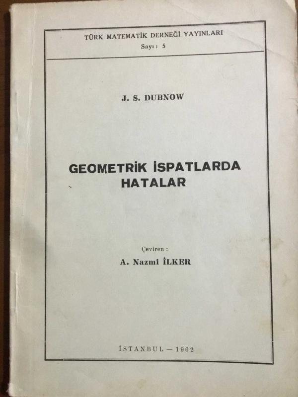 GEOMETRİK İSPATLARDA HATALAR, J.S.DUBNOW tarafından kaleme alınmıştır. Kitap 1962 yılında Türk matematik derneği tarafından [İstanbul] yayınlanmıştır. Bu baskının çevirisi A.Naz’mi ilker tarafından yapılmıştır. 61 sayfadır. GEOMETRİK İSPATLARDA HATALAR adlı eser Türkçe dilindedir.