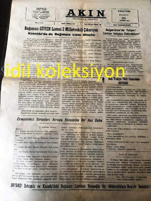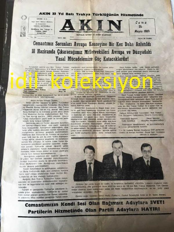 GÜMÜLCİNE -YUNANİSTAN-BATI TRAKYA-- AKIN GAZETESİ YEREL TAŞRA BASINI--26 Mayıs 1989 Sayı :982 --Cemaatımız sorunları Avrupa Konseyi Bir Kez Daha Anlatıldı 18 Haziran Çıkaracağımız Milletvekilli Avrupa ve Dünyadaki Yasal Mücadelemize Güç Katacaklardır ---Batı Trakya Türk Cemaatına Duyuru --- Bağımsız Güven Listesi 2 Milletvekili Çıkarıyor Ksantchi de Bağımsız Liste Oluştu --Bulgaristan da vahşet Türkler vahşice öldürülüyor - Yıpranma, sararmalar, kupon kesiği ve yırtılmalar zamana bağlı olarak görülebilir.