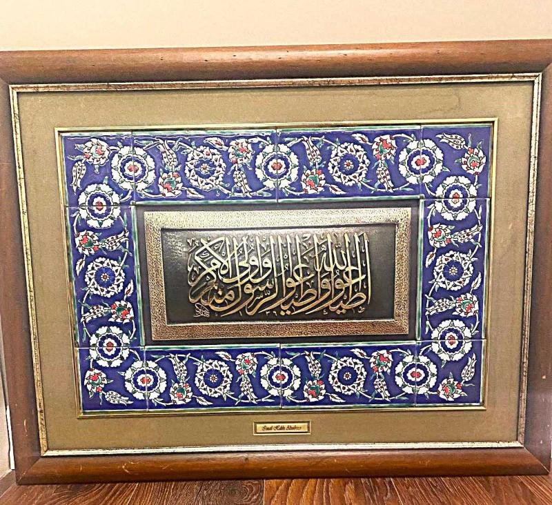 ORJİNAL İZNİK ÇİNİLERİ İLE BEZELİ ,(YAKLAŞIK YAŞI 35-40 SENE CİVARI) YAZININ TAMAMI GÜMÜŞ (990 AYAR), NİSA SURESİ 59.AYET İN BAŞI YAZILI OLAN*** يَٓا اَيُّهَا الَّذ۪ينَ اٰمَنُٓوا اَط۪يعُوا اللّٰهَ وَاَط۪يعُوا الرَّسُولَ وَاُو۬لِي الْاَمْرِ مِنْكُمْۚ فَاِنْ تَنَازَعْتُمْ ف۪ي شَيْءٍ فَرُدُّوهُ اِلَى اللّٰهِ*** وَالرَّسُولِ اِنْ كُنْتُمْ تُؤْمِنُونَ بِاللّٰهِ وَالْيَوْمِ الْاٰخِرِۜ ذٰلِكَ خَيْرٌ وَاَحْسَنُ تَأْو۪يلًا۟ OKUNUŞU: Ya eyyuhallezine amenu atiullahe ve atiur resule ve ulil emri minkum, fe in tenaza'tum fi şey'in fe rudduhu ilallahi ver resuli in kuntum tu'minune billahi vel yevmil ahir. Zalike hayrun ve ahsenu te'vila. MEALİ: Ey iman edenler, Allah'a itaat edin, peygambere de itaat edin, sizden olan yetkililere de. Sonra bir şeyde anlaşmazlığa düştünüz mü, hemen Allah'a ve Peygamberine arz edin onu, eğer Allah'a ve ahiret gününe gerçekten inanan müminler iseniz. Bu hem hayırlı hem de netice itibariyle daha güzeldir. ÜNLÜ HAT YAZI ÜSTADI İSMAİL HAKKI ALTUNBEZER** TARAFINDAN İCRA EDİLEN SERTİFİKALI* *(Kuka collection Sertifikalı Eser no:11 Ürün no:250/114,Çerçeveli ebat 82x62 cm.) TÜRKİYECE ÇOK TANINAN BİR SES SANATÇISINDAN BİNBİR RİCA VE ISRARLA ALINMIŞ NEFİS BİR HAT ESER DİR..... **İSMAİL HAKKI ALTUNBEZER:Türk hattatı, tezhip sanatçısı ve tuğrakeşidir 1873 yılında İstanbul'da doğdu. Bazı kaynaklarda 1869 olarak geçen doğum tarihi mezar taşında 1873 olarak geçmektedir. Hattat İlmî Efendi'nin oğlu olan İsmail Hakkı Altunbezer, Fatih Rüştiyesi'nde öğrenim görüp, hat çalışmalarında ilk kez babasından ders aldı. Divan-ı Hümayun kalemine girip (1890), Sami Efendi'den celî, sülüs, tuğra yazı üsluplarını öğrendi. İki yıl sonra birinci tuğrakeşliğe getirilip, Sanayii Nefise'nin hattatlık bölümünü bitirdi (1896). Üsküdar İdadisi'nde yazı, Topkapı Rüştiyesi'nde resim, Galatasaray Sultanisi'nde ve Darülmuallimi'nde yazı öğretmenliği yaptı. Medreset Ülhattatin'de tuğra ve celi-sülüs yazı öğretmenliğine atandı. Cumhuriyet döneminde Güzel Sanatlar Akademisi doğu süsleme sanatları şubesi müdürlüğüne getirilip, birçok öğrenci (Halim Özyazıcı, Mecit Bey gibi) yetiştirdi. Selimiye, Edirnekapı, Zeynep Sultan, Abdi Subaşı camilerindeki yazılarıyla ün salan İsmail Hakkı Altunbezer, tezhipte zamanla kendine özgü bir üslup geliştirmiş, resimde klasik akımı izlemiştir. 1946 yılında vefat eden Altunbezer Karacaahmet mezarlığında yatmaktadır. Mezar Kitabesi, kendisinden yirmi iki yıl önce vefat eden babasınınkiyle beraber, Hezarfen Hattat Necmeddin Okyay tarafından 1957'de celî talik hatla yazılmıştır. BU OBJEYİ-ÜRÜNÜ HİÇ TEREDDÜT ETMEDEN GÖNÜL RAHATLIĞI İLE ALABİLİRSİNİZ....ALMADAN ÖNCE MESAJ ATIP BİLGİ ALABİLİRSİNİZ,SORULARINIZA CEVAP VERMEK BENİ MUTLU EDECEKTİR. BEĞENMEDİĞİNİZ ÜRÜNÜ BANA HER ZAMAN(1hafta içinde kırılmadıysa ve zarar görmediyse tabi takdir edersiniz ki:))) GERİ GÖNDEREBİLİRSİNİZ SORGUSUZ SUALSİZ GERİ ALIRIM...(Burada amaç aldığınızdan keyif duyuyor ve zevk alıyor olmanız)...VE BANA SONUNA KADAR ÜRÜNLER KONUSUNDA GÜVENEBİLİRSİNİZ.... NOT: İSMİMİN BİRAZ SOL ALTINDA YAZAN ''TÜM İLANLARI'' YAZISININ ÜSTÜNE TIKLARSANIZ DİĞER İLANLARIMI GÖREBİLİRSİNİZ ARALARINDA SİZ ZEVK SAHİBİ HANIMLAR VE BEYLER İÇİN PORTFÖYÜM;İLGİNÇ VE ENTERESAN ANTİKALAR VE KOLEKSİYON OBJELERİ-ÜRÜNLERİ BARINDIRIYOR....SAYGILARIMLA SUNARIM.......