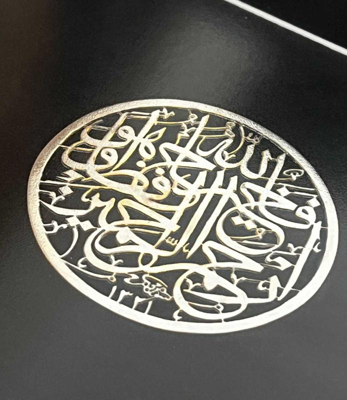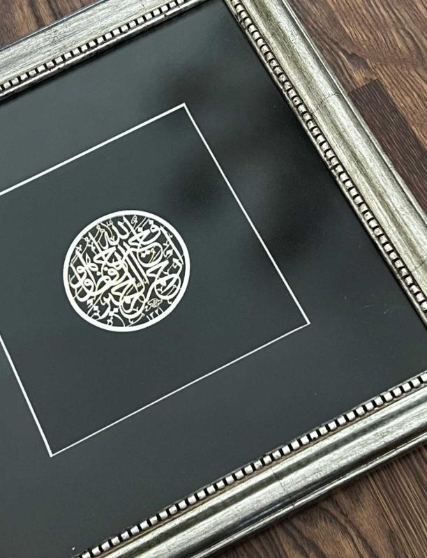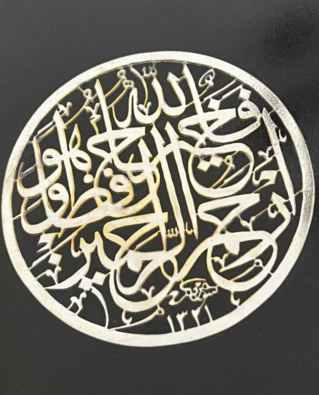 YUSUF SURESİ 64. AYET, GERÇEK GÜMÜŞ... GÜMÜŞ OLAN SÜLÜS YAZININ ÇAPI 8.5 CM DİR. TABLONUN ÖLÇÜLERİ 39 CM X 39 CM DİR.