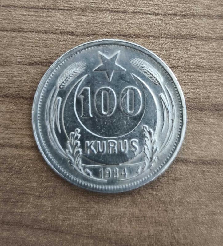 1934 – 100 Kuruş Yıl 1934 Değer 100 Kuruş (1 TL) Para birimi Eski lira ( 1923-2005 ) Kompozisyon Gümüş (.830) (Bakır .145, Nikel .025) Ağırlık 12 gr Çap 29 mm Kalınlık 1,86 mm Şekil Yuvarlak Tura yüzünde, Mustafa Kemal Atatürk’ün sola bakan portresi, etrafında “Türkiye Cumhuriyeti” ibaresi, ve altında zeytin dalları resmedilmiştir. Yazı tarafında ise 100 Kuruş ibaresi, açıklığı yukarı doğru ay ve yıldız, 1934 tarihinin etrafında meşe dalları, hilalin etrafında ise buğday başakları vardır.