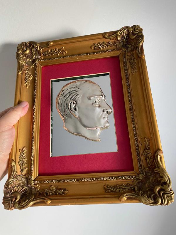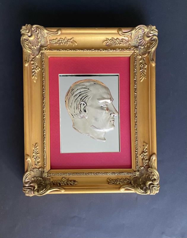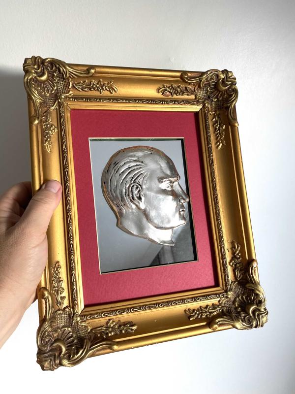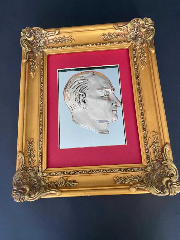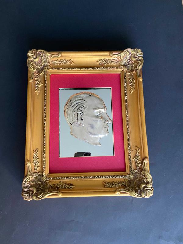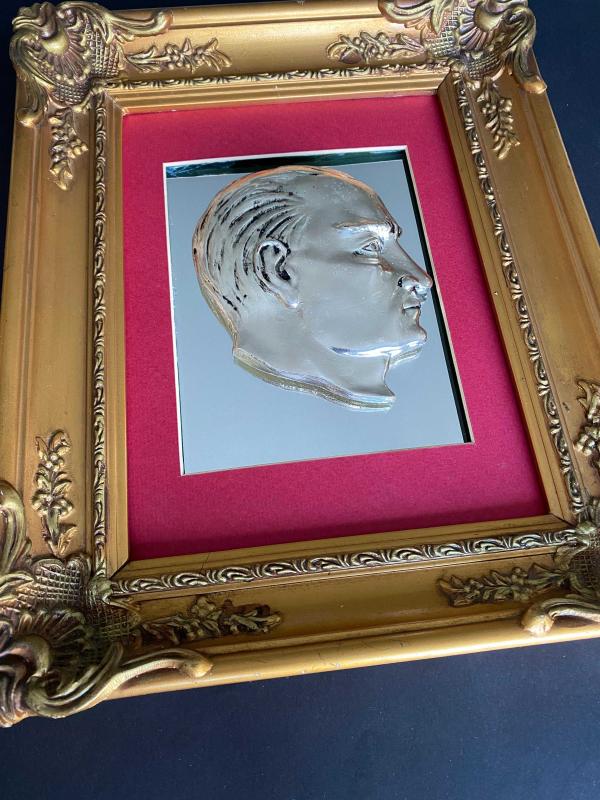 Gümüş sıvama Atatürk silüeti eski çerçeve içinde. Şahane bir eser, Atatürk silüeti ayna üzerinde ve paspartusu ile eski bir ahşap çerçeve içine oturtulmuş. Ebat: 32 x 27 cm