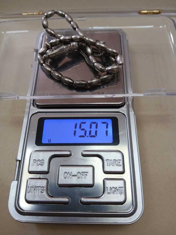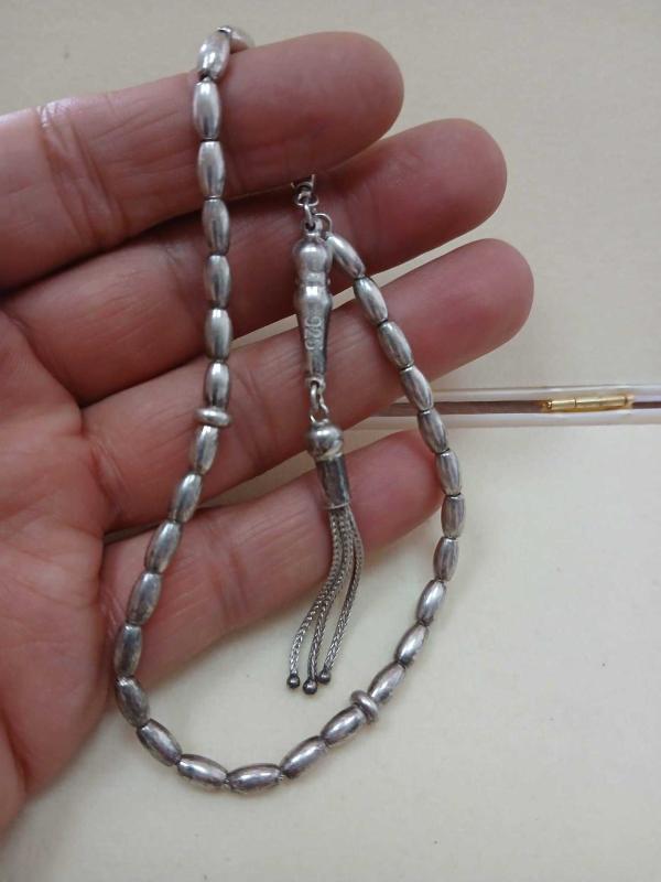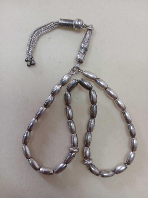 GÜMÜŞ TESBİH, BİLEKBOY 15,70 GR. ( +-1GR) 23 CM BOY 7mm-1,7mm ÖLÇÜ İMAMEDE KARARMA MEVCUT, GÖZE ÇOK HİTAP ETMİYOR. ZARARLI DEĞİL, FİYATI BU SEBEPTEN DOLAYI UYGUN GEÇİLMİŞTİR. HALİYLE SATIŞTADIR.