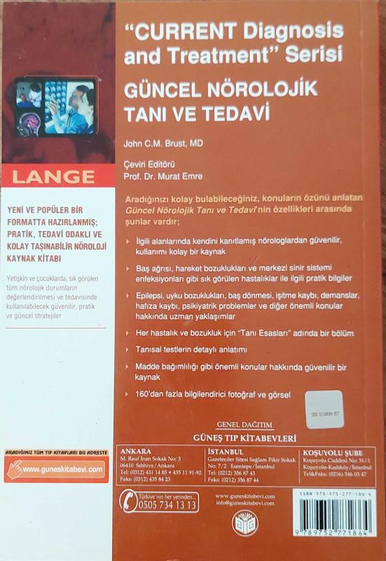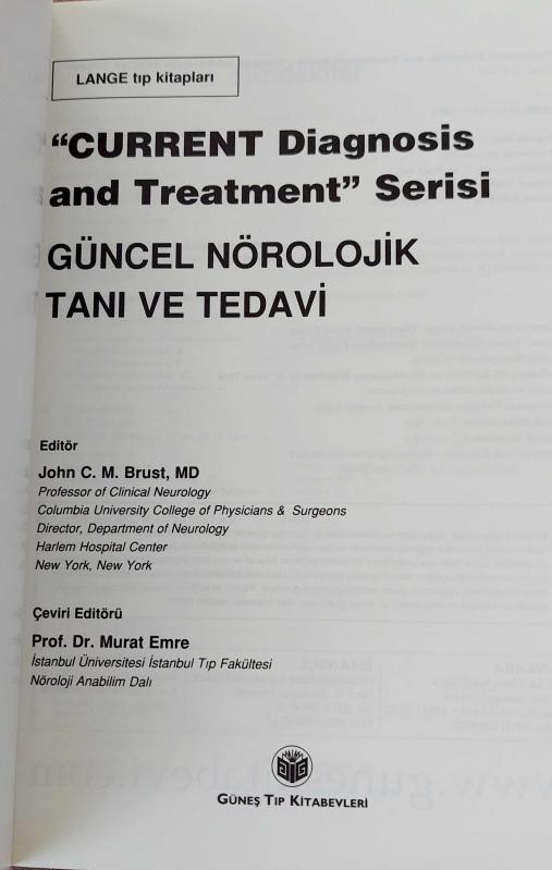 GÜNCEL NÖROLOJİK TANI VE TEDAVİ / "CURRENT Diagnosis and Treatment" Serisi (Lange), JOHN C. M. BRUST tarafından kaleme alınmıştır. Kitap 2008 yılında GÜNEŞ TIP KİTABEVLERİ tarafından [ANKARA] yayınlanmıştır. Satışta olan kitap, yayınevinin 1. baskısıdır. Bu baskının çevirisi Prof. Dr. MURAT EMRE tarafından yapılmıştır. 597 sayfadır. GÜNCEL NÖROLOJİK TANI VE TEDAVİ / "CURRENT Diagnosis and Treatment" Serisi (Lange) adlı eser Türkçe dilindedir.
