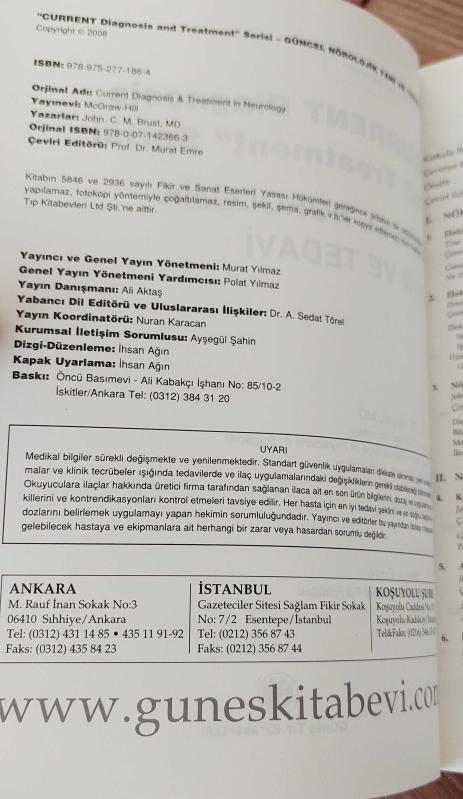 GÜNCEL NÖROLOJİK TANI VE TEDAVİ "CURRENT Diagnosis and Treatment" Serisi (Lange Tıp Kitapları) GÜNEŞ TIP KİTABEVLERİ 2008 BASKI 597 SAYFA KULLANILMAMIŞTIR.