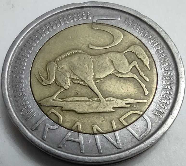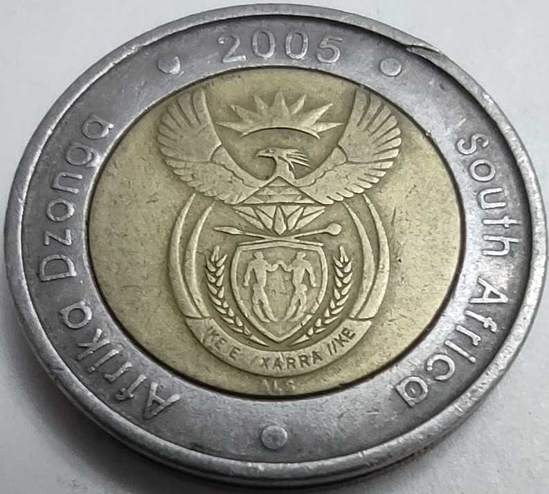 Güney Afrika Cumhuriyeti'nin nümismatik çeşitliliğini yansıtan bu 2005 baskısı 5 Rand, koleksiyonerler için "dil serisi" takibinde önemli bir yere sahiptir. Paranın ön yüzünde (obverse), ülkenin modern devlet arması ile birlikte "Afrika Dzonga" ve "South Africa" ibareleri yer alır. Arka yüzünde (reverse) ise bu serinin değişmez simgesi olan ve hızıyla bilinen Akbaş Antilobu (Black Wildebeest) tüm ihtişamıyla betimlenmiştir. Pirinç merkez ve bakır-nikel halkadan oluşan bimetal yapısı, paraya hem estetik bir derinlik katar hem de yüksek güvenlik sağlar. Kenar kısmında (edge) yer alan "SARB R5" (South African Reserve Bank) yazısı 10 kez tekrarlanarak paranın orijinalliğini tesciller.