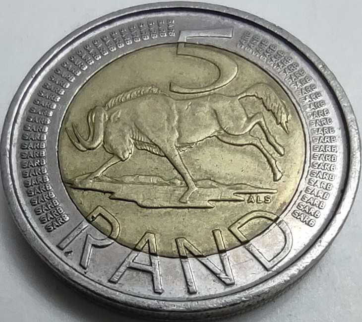 Güney Afrika'nın 2010 yılı baskısı olan bu 5 Rand, ülkenin çok kültürlü yapısını yansıtan "11 resmi dil" rotasyonunun bir parçasıdır. Paranın ön yüzünde (obverse), modern devlet arması ile birlikte Venda ve Tsonga dillerinde ülke isimleri yer alır. Arka yüzünde (reverse) ise bimetal tasarımın merkezinde, Güney Afrika steplerinin simgesi olan Akbaş Antilobu (Black Wildebeest) figürü tüm canlılığıyla betimlenmiştir. 2010 yılı, Güney Afrika için Dünya Kupası'na ev sahipliği yaptığı sembolik bir yıl olması sebebiyle bu dönem baskıları koleksiyonerler için ayrı bir hatıra değeri taşır. Pirinç merkez ve bakır-nikel halkadan oluşan bu dayanıklı yapı, yüksek güvenlikli kenar yazısıyla (SARB R5) tamamlanmıştır.