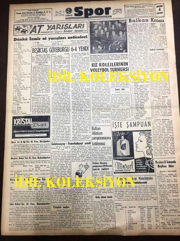 GÜNLÜK SPOR GAZETESİ - 24 MART 1958 - BASKETBOLDA GALATASARAY FENERBAHÇE'Yİ 65 - 61 YENDİ - BEŞİKTAŞ, GÖTEBURG'U 6-4 YENDİ - ANKARA'DA İKİNCİ BALKAN KROSUNU YUGOSLAV MİHALİÇ KAZANDI - İSMET ATLI DAVASINDAN VAZGEÇTİ - ZAKOPANE'DE YAPILAN KAYAK MÜSABAKASINDA DUVİLLARDA SLALOM ŞAMPİYON OLDU - 1958 İTALYA LİGLERİNDE JUVENTUS FAVORİ JOHN CHARLES GOL KRALI - KARA BOMBA JOE LOUIS - MARLENE MATTHEWS - KARAGÜMRÜK 4 - 0 ANADOLU - AMATÖR KÜMELER - KRİSTAL DROPS - AT YARIŞISI SONUÇLARI - BALKAN ATLETİZM ŞAMPİYONASINA KATILMIYORUZ, DİLAVER UZGÖREN, DİLAVER ÇORBACIOĞLU, O. A. KERMEN tarafından kaleme alınmıştır. GÜNLÜK SPOR GAZETESİ - 24 MART 1958 - BASKETBOLDA GALATASARAY FENERBAHÇE'Yİ 65 - 61 YENDİ - BEŞİKTAŞ, GÖTEBURG'U 6-4 YENDİ - ANKARA'DA İKİNCİ BALKAN KROSUNU YUGOSLAV MİHALİÇ KAZANDI - İSMET ATLI DAVASINDAN VAZGEÇTİ - ZAKOPANE'DE YAPILAN KAYAK MÜSABAKASINDA DUVİLLARDA SLALOM ŞAMPİYON OLDU - 1958 İTALYA LİGLERİNDE JUVENTUS FAVORİ JOHN CHARLES GOL KRALI - KARA BOMBA JOE LOUIS - MARLENE MATTHEWS - KARAGÜMRÜK 4 - 0 ANADOLU - AMATÖR KÜMELER - KRİSTAL DROPS - AT YARIŞISI SONUÇLARI - BALKAN ATLETİZM ŞAMPİYONASINA KATILMIYORUZ adlı eser Türkçe dilindedir.