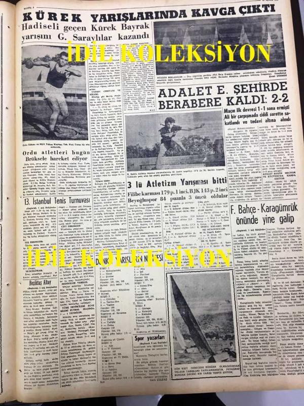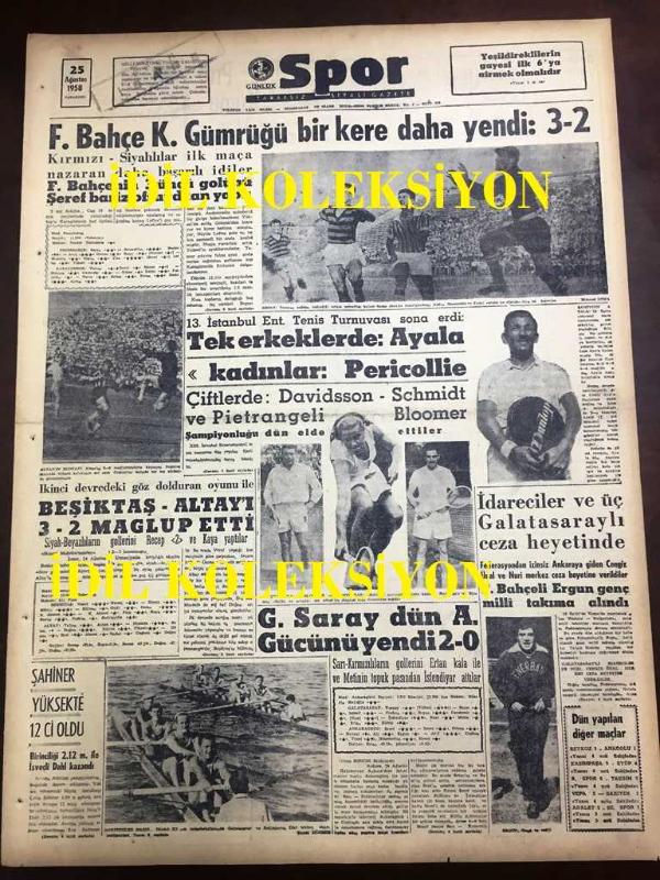 GÜNLÜK SPOR GAZETESİ - 25 AĞUSTOS 1958 - FENERBAHÇE, KARAGÜMRÜK'Ü 3-2 YENDİ - BEŞİKTAŞ - ALTAY'I 3-2 MAĞLUP ETTİ - ANKARAGÜCÜ 2 - 0 GALATASARAY - HASAN PAŞA FIRINI LALELİ - DÜNYA ORDULAR ARASO DENİZ PENTATLONU - YEŞİLDİREKLERİN GAYESİ İLK 6'YA GİRMEK OLMALI - KÜREK YARIŞLARINDA KAVGA ÇIKTI - AT YARIŞI SONUÇLARI - FENERBAHÇE, KARAGÜMRÜK ÖNÜNDE YİNE GALİP - EYÜPSPOR 4 - 3 KASIMPAŞA - TAKSİMSPOR 3 - 0 BEYOĞLUSPOR, DİLAVER UZGÖREN, DİLAVER ÇORBACIOĞLU, O. A. KERMEN tarafından kaleme alınmıştır. GÜNLÜK SPOR GAZETESİ - 25 AĞUSTOS 1958 - FENERBAHÇE, KARAGÜMRÜK'Ü 3-2 YENDİ - BEŞİKTAŞ - ALTAY'I 3-2 MAĞLUP ETTİ - ANKARAGÜCÜ 2 - 0 GALATASARAY - HASAN PAŞA FIRINI LALELİ - DÜNYA ORDULAR ARASO DENİZ PENTATLONU - YEŞİLDİREKLERİN GAYESİ İLK 6'YA GİRMEK OLMALI - KÜREK YARIŞLARINDA KAVGA ÇIKTI - AT YARIŞI SONUÇLARI - FENERBAHÇE, KARAGÜMRÜK ÖNÜNDE YİNE GALİP - EYÜPSPOR 4 - 3 KASIMPAŞA - TAKSİMSPOR 3 - 0 BEYOĞLUSPOR adlı eser Türkçe dilindedir.