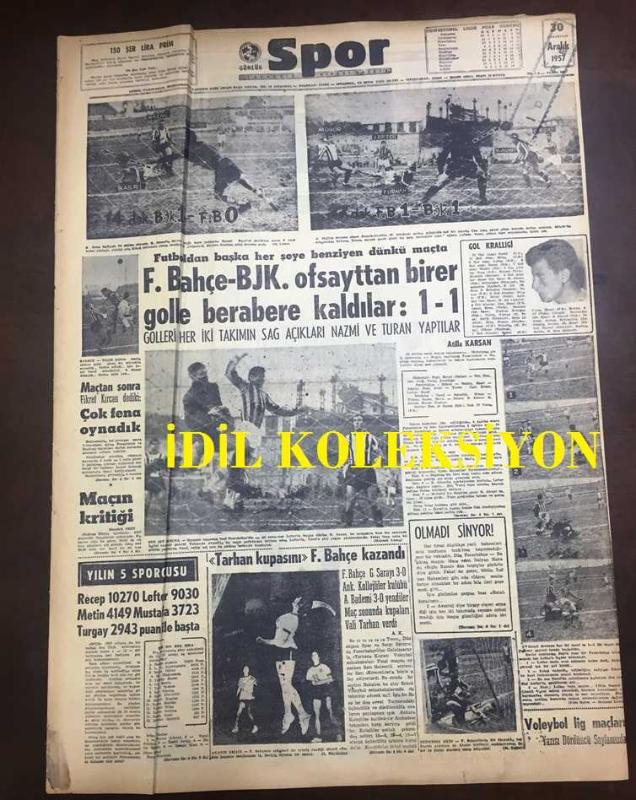 GÜNLÜK SPOR GAZETESİ - 30 ARALIK 1957 - FENERBAHÇE, BEŞİKTAŞ OFSAYTTAN BİRER GOLLE 1-1 BERABERE KALDILAR - ATİLLA KARSAN - YILIN 5 SPORCUSU, LEFTER, METİN OKTAY, TURGAY ŞEREN - TARHAN KUPASINI FENERBAHÇE KAZANDI - VOLEYBOL LİG MAÇLARI - 1957 GOL KRALLIĞI, METİN OKTAY -YAPI VE KREDİ BANKASI, 20 APARTMAN DAİRESİ TALİHLİLERİ - 3,5 YÜREKLİ ŞERİF CONES - HENRİCOS SİLVANIN GOLLERİ - YEDİ SAAT SÜREN DÜNYANIN EN UZUN BOKS MAÇI - KRİSTAL DROPS - ADALETSPOR 2 - 0 HACETTEPE - KOŞALAY KUPASI - ATATÜRK KIR KOŞUSUNDA BİR HADİSE - KÜLTÜRSPOR MANİSA'DA GALİP - AMATÖR KÜMELER