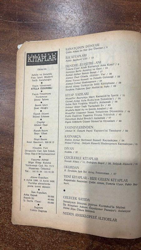 GÜNÜMÜZDE KİTAPLAR AYLIK KÜLTÜR DERGİSİ - SAYI : 10 – EKİM 1984 ÇETİN ALTAN – TOMRİS UYAR – FAKİR BAYKURT – SÜREYYA BERFE – KEMAL SÜLKER – AHMET ÖNEL – HİLMİ YAVUZ – AHMET CEMAL – MERAL ALPAY – İBRAHİM YILDIRIM – MUZAFFER BUYRUKÇU – GÜRSEL AYTAÇ – SELİM İLERİ – SENNUR SEZER – MUSTAFA BALEL – MUZAFFER UYGUNER – SÜLEYMAN BULUT – FATİH ÖZGÜVEN – FİGEN GÖKBERK – AHMET N. ÖZTÜRK – HATİCE AYNUR – NECATİ ABACI – ERDOĞAN BAŞOL – SELÇUK HÜNERLİ – H. İBRAHİM IŞIK – MESUT YALVAÇ HER ŞEY ÜZERİNE – ÇİLLİ – ALLAH KURTARSIN AMA KİMİ – ANTOLOJİ VE ÖZET – REMZİ BENGİ – OLTADA KÜLTÜR VAR – RUSSELL VE FELSEFE GELENEĞİ – SHAKESPEARE – TÜRKİYE’DE MİLLİ KÜTÜPHANE – ŞAİR NEDİM’İN AŞKI – MAVİ KARANLIK’TA İÇERİK – TUTSAKLAR – VIRGINIA WOOLF’U ANLAMAK – TAŞLI TARLADAKİ EV – AY VE ŞENLİK ATEŞLERİ – İNSAN YETİŞTİRME DÜZENİMİZ – YAŞAMIN UCUNA YOLCULUK – BRECHT’İ ANLAMAK – GÜNER SÜMER’İN OYUNLARI – PAYEL YAYINEVİ – BERTRAND RUSSELL KAYNAKÇASI – SHAKESPEARE KAYNAKÇASI – NEDİM – BİR AVUÇ FOTOROMAN – YENİ - 64 SAYFA, ERCAN ARIKLI tarafından kaleme alınmıştır. Eser TANJU GÖKÇÖL editörlüğünde hazırlanmıştır. Kitap . tarafından yayınlanmıştır. 64 sayfadır. GÜNÜMÜZDE KİTAPLAR AYLIK KÜLTÜR DERGİSİ - SAYI : 10 – EKİM 1984 ÇETİN ALTAN – TOMRİS UYAR – FAKİR BAYKURT – SÜREYYA BERFE – KEMAL SÜLKER – AHMET ÖNEL – HİLMİ YAVUZ – AHMET CEMAL – MERAL ALPAY – İBRAHİM YILDIRIM – MUZAFFER BUYRUKÇU – GÜRSEL AYTAÇ – SELİM İLERİ – SENNUR SEZER – MUSTAFA BALEL – MUZAFFER UYGUNER – SÜLEYMAN BULUT – FATİH ÖZGÜVEN – FİGEN GÖKBERK – AHMET N. ÖZTÜRK – HATİCE AYNUR – NECATİ ABACI – ERDOĞAN BAŞOL – SELÇUK HÜNERLİ – H. İBRAHİM IŞIK – MESUT YALVAÇ HER ŞEY ÜZERİNE – ÇİLLİ – ALLAH KURTARSIN AMA KİMİ – ANTOLOJİ VE ÖZET – REMZİ BENGİ – OLTADA KÜLTÜR VAR – RUSSELL VE FELSEFE GELENEĞİ – SHAKESPEARE – TÜRKİYE’DE MİLLİ KÜTÜPHANE – ŞAİR NEDİM’İN AŞKI – MAVİ KARANLIK’TA İÇERİK – TUTSAKLAR – VIRGINIA WOOLF’U ANLAMAK – TAŞLI TARLADAKİ EV – AY VE ŞENLİK ATEŞLERİ – İNSAN YETİŞTİRME DÜZENİMİZ – YAŞAMIN UCUNA YOLCULUK – BRECHT’İ ANLAMAK – GÜNER SÜMER’İN OYUNLARI – PAYEL YAYINEVİ – BERTRAND RUSSELL KAYNAKÇASI – SHAKESPEARE KAYNAKÇASI – NEDİM – BİR AVUÇ FOTOROMAN – YENİ - 64 SAYFA adlı eser Türkçe dilindedir.