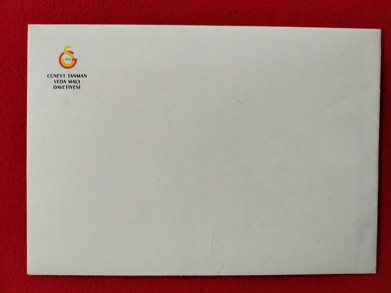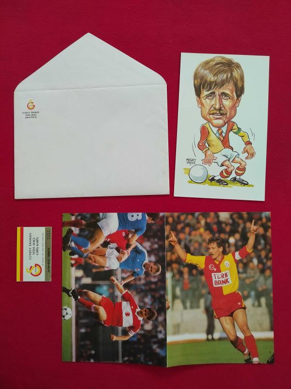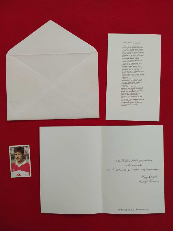 Galatasaray Cüneyt Tanman Jübile Davetiyesi + 26 Temmuz 1991 - İstanbul İnönü Stadı Giriş Bileti + Biyografi, Çizim Karikatür, Zarf - Tam Takım Set