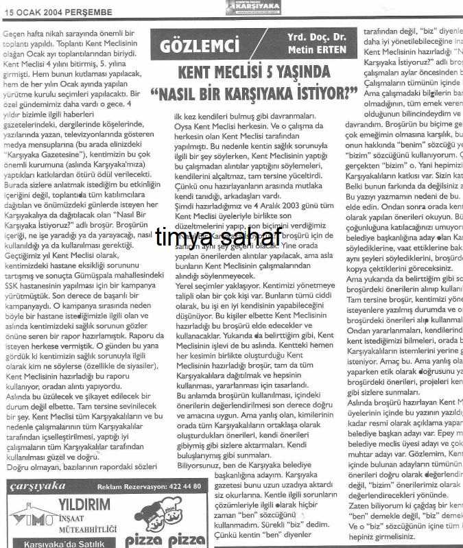 Gazete küpürü Karşıyaka 15.01.2004 Karşıyaka Kent Meclisi Metin Erten, 1 yıl önce satışa sunulmuştur.