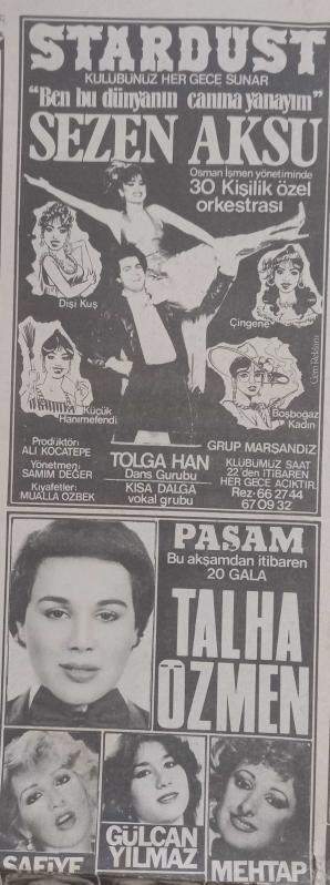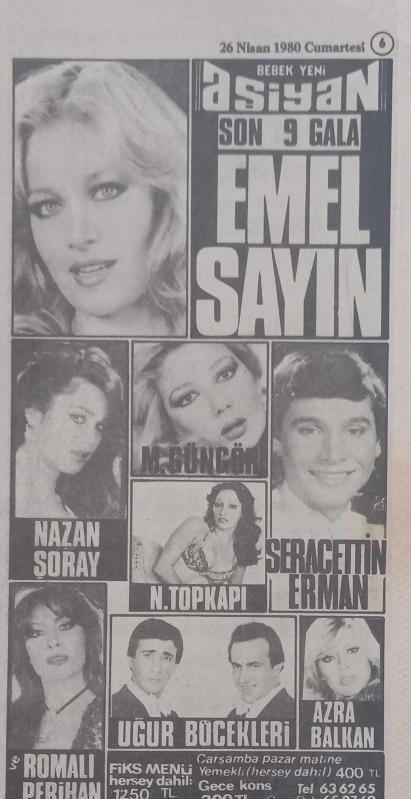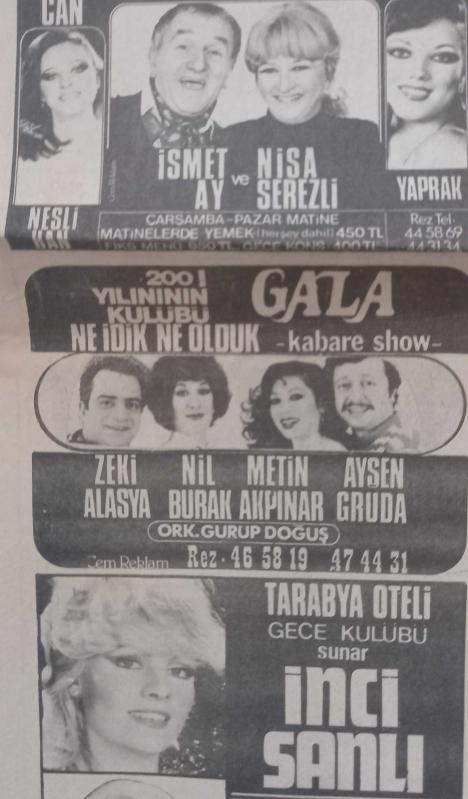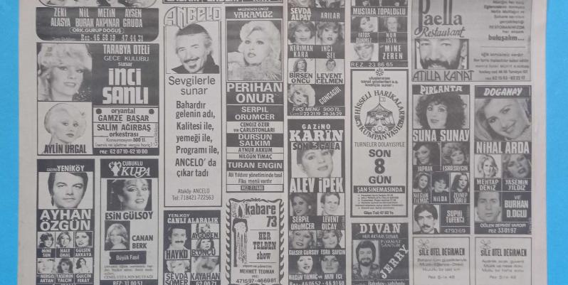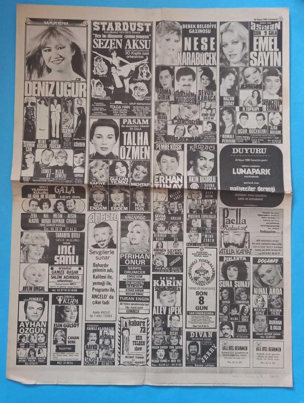 Gazino Reklamları Gazetesi 26 Nisan 1980 Deniz Uğur,Sezen Aksu,İbrahim Tatlıses,Sevda Jaraca,Fatma Girik,Mine Koldaş,Romalıların Perihan,Azra Balkan,Emel Sayın,Neşe Jaraböcek,Talha Özmen,Perihan Onur,İnci Şanlı,Ayşen Gruda,Nil Burak,Zeki Alasya,Metin Akpınar,Sulhi Tüfekçi,Nur Işık,Akev İpek,Erhan Tunay,Mustafa Tooaloğku,Nihal Arda,Suna Sunay,Talha Özmen,Nazan Şoray,Nisa serezl8 ,İsmet ay, en son 2 yıl önce güncellenmiştir.