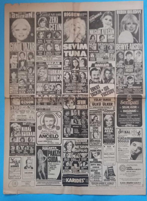 Gazino Reklamları Gazetesi Gönül Yazar,Zeki Çetin,Sevim Tuna,Nilgün Atılgan,Behiye Aksoy,Tanju Okan,Ahmet Özhan,Tülay Karaca,Mine Soley,Saadet Sun,Nuri Sesigüzel,Nazan Şoray,Leyla Sayar,Göksel Arsoy,Huysuz Virjin,Enis Fosforoğku,Nesrin Sipahi,Mine sun,Semiha Yankı,Pakize Suda,Nihal Köknar,Nihal Arda,Berkant,Ancelo,Hayko,Ayhan Özgün,Erkut Taşkın,Işıl Yücesoy,Tülay Tansu,Enis Fisfiroglu,Kutlu Payaslı,Türkan Tunca,Ömür Göksel,Nihal Arda,Nil Burak,Sevda Ferdağ,Nejat Alp,Bedri Ayseli,Müjdat Gezen,Hayko,Feri Cansel başlıklı ürün, Efemera, Müzik, Sinema > Diğer Efemera kategorisi altında İkinci El olarak satılmaktadır.