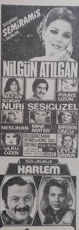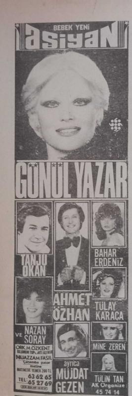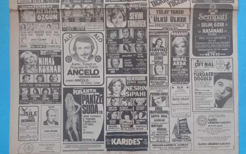Gazino Reklamları Gazetesi Gönül Yazar,Zeki Çetin,Sevim Tuna,Nilgün Atılgan,Behiye Aksoy,Tanju Okan,Ahmet Özhan,Tülay Karaca,Mine Soley,Saadet Sun,Nuri Sesigüzel,Nazan Şoray,Leyla Sayar,Göksel Arsoy,Huysuz Virjin,Enis Fosforoğku,Nesrin Sipahi,Mine sun,Semiha Yankı,Pakize Suda,Nihal Köknar,Nihal Arda,Berkant,Ancelo,Hayko,Ayhan Özgün,Erkut Taşkın,Işıl Yücesoy,Tülay Tansu,Enis Fisfiroglu,Kutlu Payaslı,Türkan Tunca,Ömür Göksel,Nihal Arda,Nil Burak,Sevda Ferdağ,Nejat Alp,Bedri Ayseli,Müjdat Gezen,Hayko,Feri Cansel, en son 2 yıl önce güncellenmiştir.