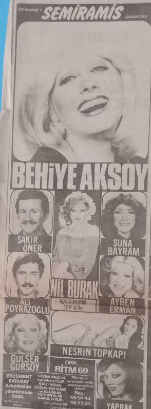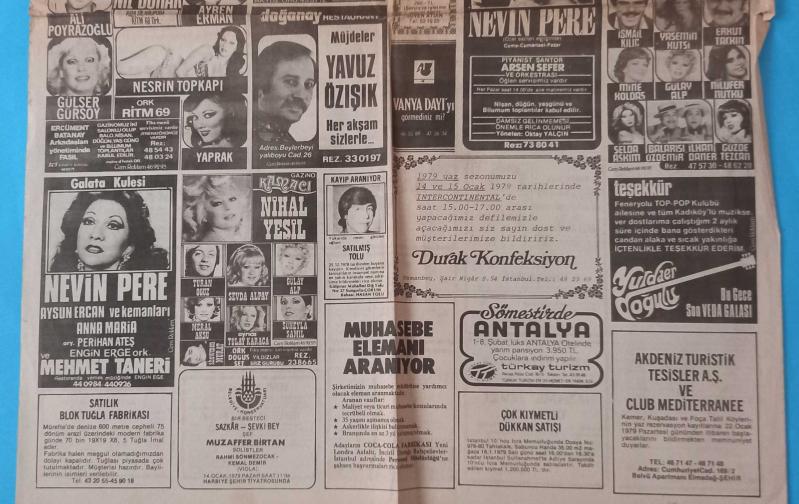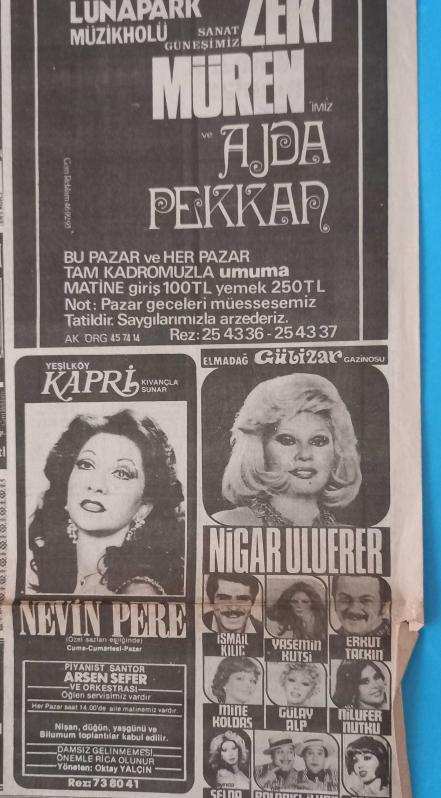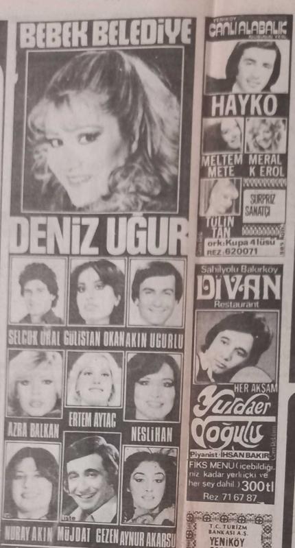 Gazino Reklamları Gazetesi ocak 1979 Behiye Aksoy,Deniz Uğur,Hayko,Zeki Müren,Tülin Tan,Nuray Akın,Müjdat Gezen,Şakir Öner,Suna Bayram,Nil Burak,Azra Akın,Neslihan,Yurdaer Doğulu,Meltem Mete,Nigar Uluerer,Selda Aşkım,Gözde Tezcan,Erkut Taşkın,Nevin Pere,Nihal Yeşil,Tülay Karaca,Yaprak,Nesrin Topkapı,Yasemin Kutsu,Yavuz Özışık, en son 2 yıl önce güncellenmiştir.