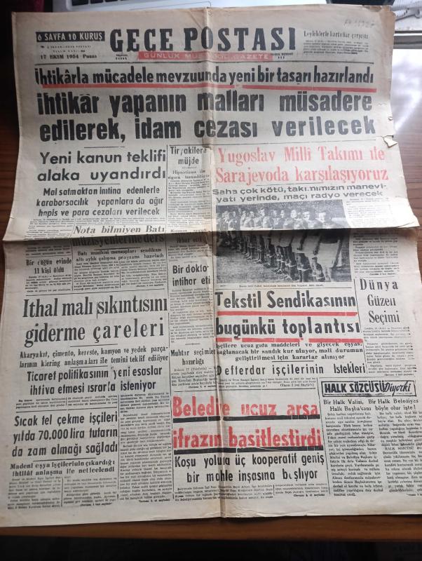 Gece Postası Gazetesi - 17 Ekim 1954 - ihtikarla mücadele mevzuunda yeni bir tasarı hazırlandı - ihtikar yapanın malları müsadere edilerek idam cezası verilecek - tiryakilere müjde hipnotizma ile sigara terk ediliyor - Yugoslav milli takımı ile sarajevo'da karşılaşıyoruz Fotoğraflar - nota bilmeyen Batı müzisyenlerine ders - dünya güzeli seçimi - muhtar seçimleri hazırlığı - günün perdesinde karagöz ile hacivat yazan Çelebi - Sende mi Brütüs Yazan Murat Sertoğlu - Üsküdar tramvaylarına vekalet el koydu fotoğraf - Sabite Tur ve Gönül Yazar İstanbul'un Nezih aile salonu Turkuazda - kaçın Türkler geliyor filmi İnci ve Taksim sinemasında - Basri Dirimlili yine sol bek olarak vazifelendirildi Fotoğrafı - Haf olarak çağrılan fakat sol içi oynayacak fenerbahçe'li Mehmet Ali Has Fotoğrafı - beşiktaşlılarla takviye edilen Fenerbahçe Galatasaray Adalet karmasıyla oynuyor - dün geceki güreşler Almanlar 4 Kasımpaşa 4 - Turgay Şeren Lefter Küçükandonyadis milli formayla fotoğraf adlı eser, Kitap > Süreli Yayınlar > Gazeteler > Türkiye > Genel > Günlük kategorisinde İkinci El olarak satıştadır.