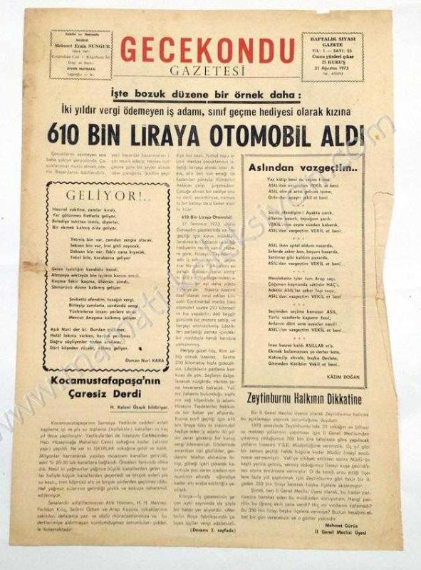 Gecekondu gazetesi, 31 Ağustos 1973, Sayı:25 adlı eser, Kitap > Süreli Yayınlar > Gazeteler > Türkiye > Mahalli kategorisinde İkinci El olarak satıştadır.