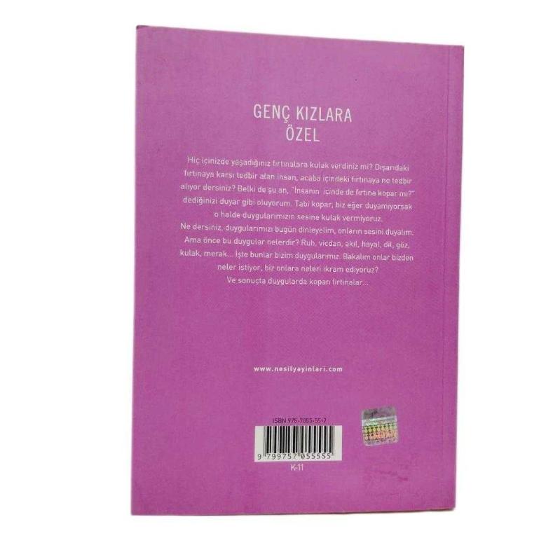 * Genç Kızlara Özel Esra Nuray Sezer NESİL YAYINLARI Duygularımızı dinleyelim, onların sesini duyalım . Ama önce bu duygular nelerdir.Onlar mı? Fıtrat, ruh, kalp, vicdan, akıl, hayal, dil, göz, kulak, merak, işte bunlar bizim duygularımız bakalım onlar bizden neler istyor, biz onlara neler ikram ediyoruz? Ve kopan fırtınalar. Yayın Tarihi: 2005 Sayfa Sayısı: 192 Cilt Tipi: Karton Kapak Kağıt Cinsi: 1. Hm. Kağıt Boyut: 13.5 x 19 cm
