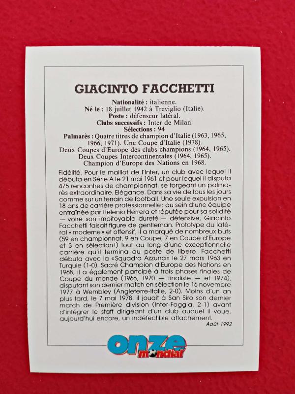 Giacinto Facchetti - İnter - Onze Mondial Football Collection Photo Card - 14X10 cm - Futbol Koleksiyon Fotokart