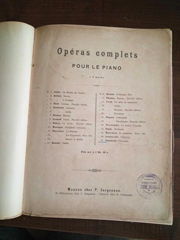Gioconda Opera di A. Ponchielli pour le piano, A. Ponchielli tarafından kaleme alınmıştır. Kitap Chez P. Jurgenson tarafından [Moscou] yayınlanmıştır. 137 sayfadır. Gioconda Opera di A. Ponchielli pour le piano adlı eser Rusça dilindedir. Eserin içeriğinde Fransızca dilinde bölümlere de yer verilmektedir.