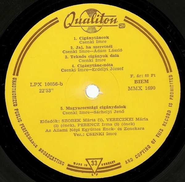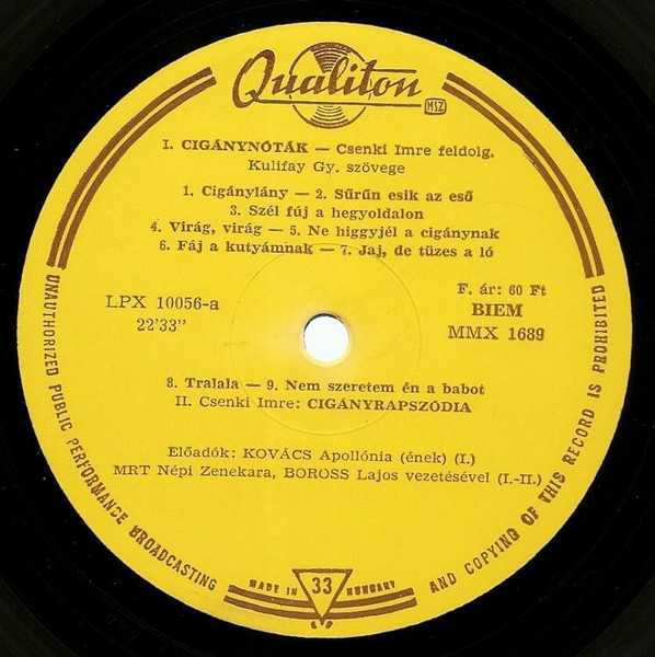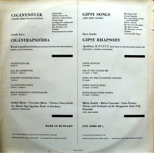 Fotoğraftaki gibi temiz, çok titiz kullanılmış, ilk sahibinden, kütüphane plağı. Imre Csenki – Cigányrapszódia - Gipsy Rhapsody Imre Csenki - Cigányrapszódia - Gipsy Rhapsody album cover Çekoslavak Genre:Folk, World, & Country Style:Folk Year:1963 Cigánynóták (Gipsy Songs) 22:33 Cigánylány (The Gipsy Girl) Sűrűn Esik Az Eső (It Rains Heavily) Szél Fúj A Hegyoldalon (The Wind Blows On The Mountainside) Virág, Virág (Flower, Flower) Ne Higgyél A Cigánynak (Do Not Trust The Gipsy) Fáj A Kutyámnak (My Dog Is Ailing) Jaj, De Tüzes A Ló (Oh, How Firy A Horse) Tralala Nem Szeretem Én A Babot (I Do Not Like Beans) Cigányrapszódia (Gipsy Rhapsody) 22:53 Cigánytáncok (Gipsy Dances) Jaj, Ha Szeretnél (Oh, If You Loved Me) Teknős Cigányok Dala (Song Of The Scooping Gypsies) Cigánytánc-Nóta (Gipsy Dance-Song) Magyarországi Cigánydalok (Hungarian Gipsy Songs)