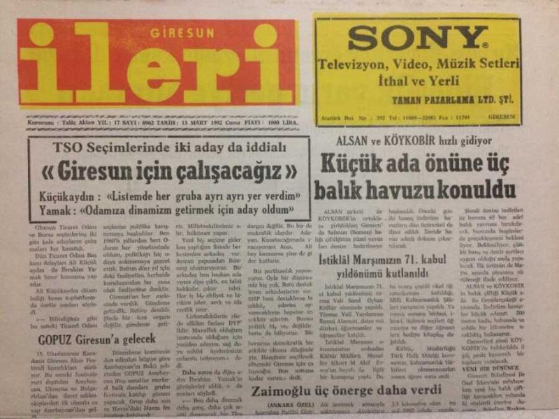 Giresun İleri Gazetesi 13 Mart 1992 - Küçük Ada Önüne Balık Havuzu Konuldu GZ34508, en son 20 gün önce güncellenmiştir.