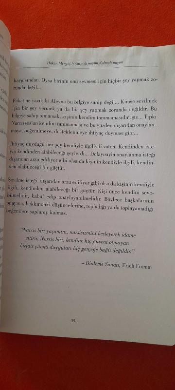 Gitmeli miyim Kalmalı mıyım Kitap Açıklaması Kusur bulanların yanında huzur bulamazsınız... Dört bir yanımız, dünyanın kendi etrafında döndüğüne inanan narsislerle çevrili... İşin garibi, bir narsise âşık olmak fazlasıyla kolay... Çünkü onlar üstün zekâları, manipülasyon kabiliyetleri ve karizmalarıyla yeryüzünün en çekici âşıkları... Ne yazık ki sevmek yerine, seviyor gibi yapabilme ustalıkları yadsınamayacak kadar güçlü... Hakan Mengüç’ün kaleme aldığı GİTMELİ MİYİM KALMALI MIYIM adlı bu kitap romancılığın ezberlerini bozarak yepyeni bir okuma disiplini vaat etmesinin yanı sıra, narsisizmin gölgesinde yaşanan huzursuz ve mutsuz ilişkilerin psikolojik dehlizlerine inerek günümüz ilişkilerine ayna tutuyor. Bu kitapta bir narsisin yarattığı alevlerle dolu sahte cennetten nasıl kaçabileceğinizin ve giderek yok edilmekte olan özgüveninizi nasıl geri kazanabileceğinizin ipuçlarıyla da karşılaşıyor olacaksınız. Çünkü bu sadece bir roman değil, aynı zamanda bir kurtuluş yolu... Aleyna ve Ertan’ın “aşk gibi” görünen savaşında kendinizden çok şey bulacaksınız.